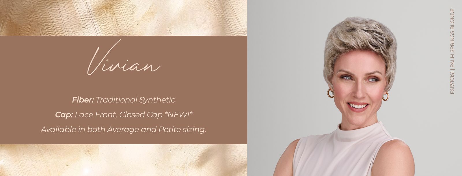 Vivian is a chic, short synthetic style designed with subtle texture for customizable volume or sleek styling. Crafted in premium Synthetic fiber, it features our extended SmartLace™ lace front for a hyper-realistic hairline and a closed cap that delivers structured shape and full coverage of base materials. Available in both Average and Petite cap sizes, Vivian offers a tailored, salon-exclusive fit that ensures clients look and feel confident.